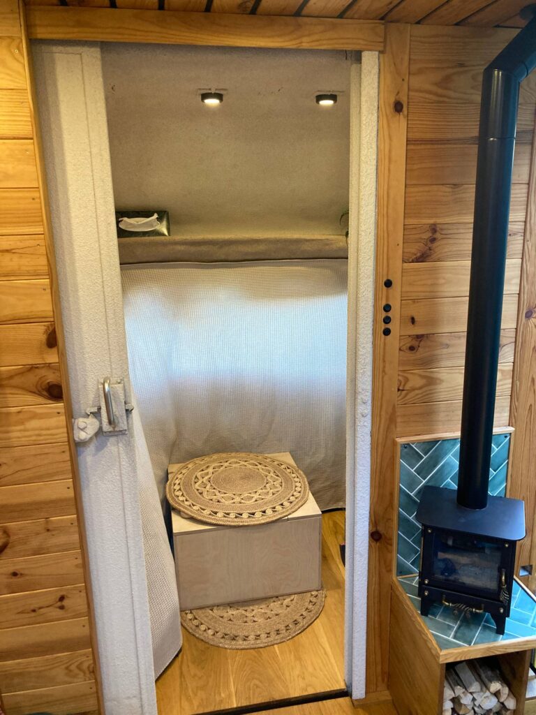 Deshalb habe ich auf natürliche Materialien und viel Tageslicht Wert gelegt. Das gesamte Studio ist mit Holz verkleidet, und große Fenster sorgen für einen hellen, offenen Raum. Für Geborgenheit und den ggf. nötigen Sichtschutz gibt es Plissees. Ein kleiner Holzofen macht es wohlig warm. Im Frontbereich des Fahrzeugs befindet sich ein kleiner, separater Raum mit Trocken-Trenn-Toilette und Umkleidebereich.